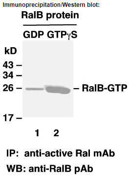 Ral activation assay. Purified RalB proteins were immunoprecipitated after treated with GDP (lane 1) or GTPγS (lane 2). Immunoprecipitation was done with the anti active Ral monoclonal antibody (Cat. No. 26913). Immunoblot was with an anti RalB rabbit polyclonal antibody (Cat. No. 21033). |