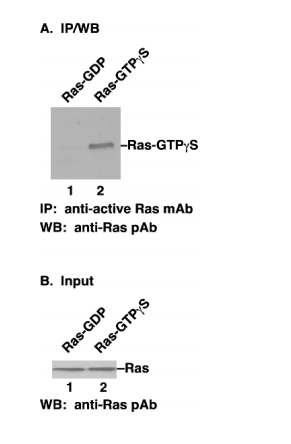 Ras 蛋白用 GDP處理 (lane 1) 或 GTPγS (lane 2) 用抗活性的 Ras進(jìn)行免疫沉淀(Cat. No. 26910).用 anti Ras rabbit polyclonal antibody(Cat. No. 21021). 做免疫印跡分析。(圖A)