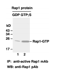 純化的Rap1蛋白用GDP處理 (lane 1) 或 GTPγS (lane 2) 用抗活性的Rap1進(jìn)行免疫沉淀(Cat. No. 26912).用 anti Rap1 rabbit polyclonal antibody(Cat. No. 21104). 做免疫印跡分析。
