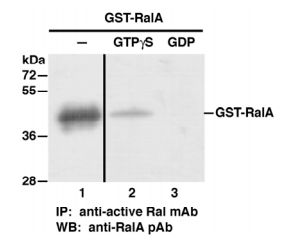 純化的GST-RalA蛋白 用GDP處理 (lane 3) 或 GTPγS (lane 2).用 GST-RalA protein (lane 1) 做為對照。用用抗活性的Ral進行免疫沉淀(Cat. No. 26913).用 anti RalA rabbit polyclonal antibody(Cat. No. 21034). 做免疫印跡分析。