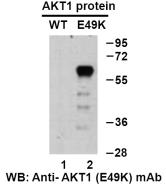 Western blot analysis of recombinant AKT1(E49K) and wildtype proteins. Purified His-tagged AKT1(E49K) protein (lane 2) and corresponding wild type protein (lane 1) were blotted with Anti AKT1(E49K) monoclonal antibody (Cat. #26137). |