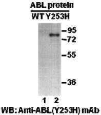 ![]() | Western blot analysis of recombinant Abl(Y253H) and wildtype proteins. Purified His-tagged Abl(Y253H) protein (amino acids 1-76, lane 2) and corresponding wild type protein (lane 1) were blotted with anti-Abl(Y253H) mouse monoclonal antibody (Cat. #26154). |