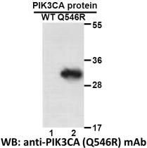 Western blot analysis of recombinant PIK3CA(Q546R) and wildtype proteins. Purified His-tagged PIK3CA(Q546R) protein (lane 2) and corresponding wildtype protein (lane 1) were blotted with Anti PIK3CA(Q546R) monoclonal antibody (Cat. #26214). |