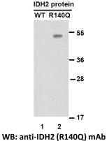 Western blot analysis of recombinant IDH2(R140Q) and wildtype proteins. Purified His-tagged IDH2(R140Q) protein (lane 2) and corresponding wildtype protein (lane 1) were blotted with anti IDH2(R140Q) monoclonal antibody (Cat. #26165). |