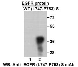 Western blot analysis of recombinant EGFR(L747-P753) S and wildtype proteins. Purified His-tagged EGFR(L747-P753)S protein (702-987) and wild-type protein (702-987) were blotted with anti EGFR(L747-P753)S mouse antibody (Cat. #26287). |