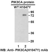 Western blot analysis of recombinant PIK3CA(H1047Y) and wildtype proteins. Purified His-tagged PIK3CA(H1047Y) protein (lane 2) and corresponding wildtype protein (lane 1) were blotted with Anti PIK3CA(H1047Y) monoclonal antibody (Cat. #26216). |