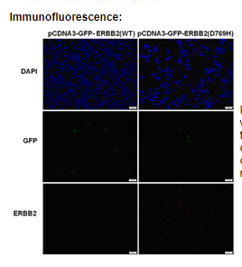 Immunofluorescence of cells expressing ERBB2 proteins with Anti ERBB2(D769H) antibody. HEK293T cells were transfected with pCDNA3-GFP ERBB2(WT) plasmid (left column) or pCDNA3-GFP ERBB2(D769H) plasmid (right column), then fixed and stained with Anti ERBB2(D769H) monoclonal antibody (Cat. #26381).