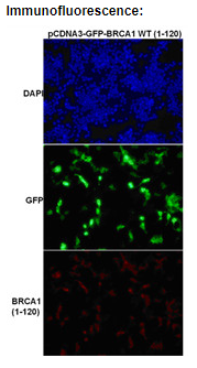 Immunofluorescence of cells expressing BRCA1(1-120)protein with Anti BRCA1(1-120) antibody. HEK293T cells was transfected with pCDNA3-GFP-BRCA1(1-120) plasmid, then fixed and stained with Anti BRCA1(1-120) monoclonal antibody (Cat. #26351-1). |