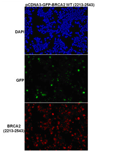 Immunofluorescence of cells expressing BRCA2(2213-2543)protein with Anti BRCA2(2213-2543) antibody. HEK293T cells was transfected with pCDNA3-GFP-BRCA2(2213-2543) plasmid, then fixed and stained with Anti BRCA2(2213-2543) monoclonal antibody (Cat. #26364-3). |