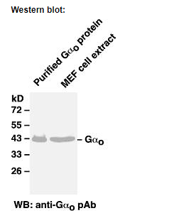 Western blot analysis of Go proteins. Whole-cell lysate of MEF cells or purified Gαo protein were used for western blots with the polyclonal anti Gαo antibody (Cat # 21015). |