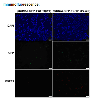 Immunofluorescence of cells expressing FGFR1 proteins with Anti FGFR1(P252R) antibody. HEK293T cells were transfected with pCDNA3-GFP-FGFR1(WT) plasmid (left column) or pCDNA3-GFP-FGFR1(P252R) plasmid (right column), then fixed and stained with Anti FGFR1(P252R) monoclonal antibody (Cat. #26249). |