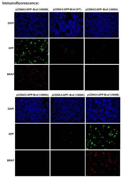 | Immunofluorescence of cells expressing BRAF proteins with Anti BRAF(V600M) antibody. HEK293T cells were transfected with pCDNA3-GFP BRAF(V600M) plasmid, pCDNA3-GFP BRAF(WT) plasmid, pCDNA3-GFP BRAF (V600A) plasmid, pCDNA3-GFP BRAF(V600G) plasmid, pCDNA3-GFP BRAF(V600K) plasmid or pCDNA3-GFP BRAF (V600E) plasmid , then fixed and stained with Anti BRAF(V600M) monoclonal antibody (Cat. #26462). |