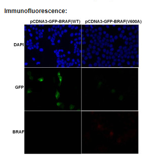 Immunofluorescence of cells expressing BRAF proteins with Anti BRAF(V600A) antibody. HEK293T cells were transfected with pCDNA3-GFP BRAF(WT) plasmid, pCDNA3-GFP BRAF(V600A) plasmid, pCDNA3-GFP BRAF(V600D) plasmid, pCDNA3-GFP BRAF(V600G) plasmid pCDNA3-GFP-BRA (V600M) plasmid or pCDNA3-GFP BRAF(V600E) plasmid, then fixed and stained with Anti BRAF(V600A) monoclonal antibody (Cat. #26199).