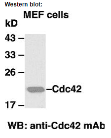 Western blot analysis of Cdc42 proteins. MEF whole-cell lysate was used for western blot with the monoclonal anti Cdc42 antibody (cat # 26008). |